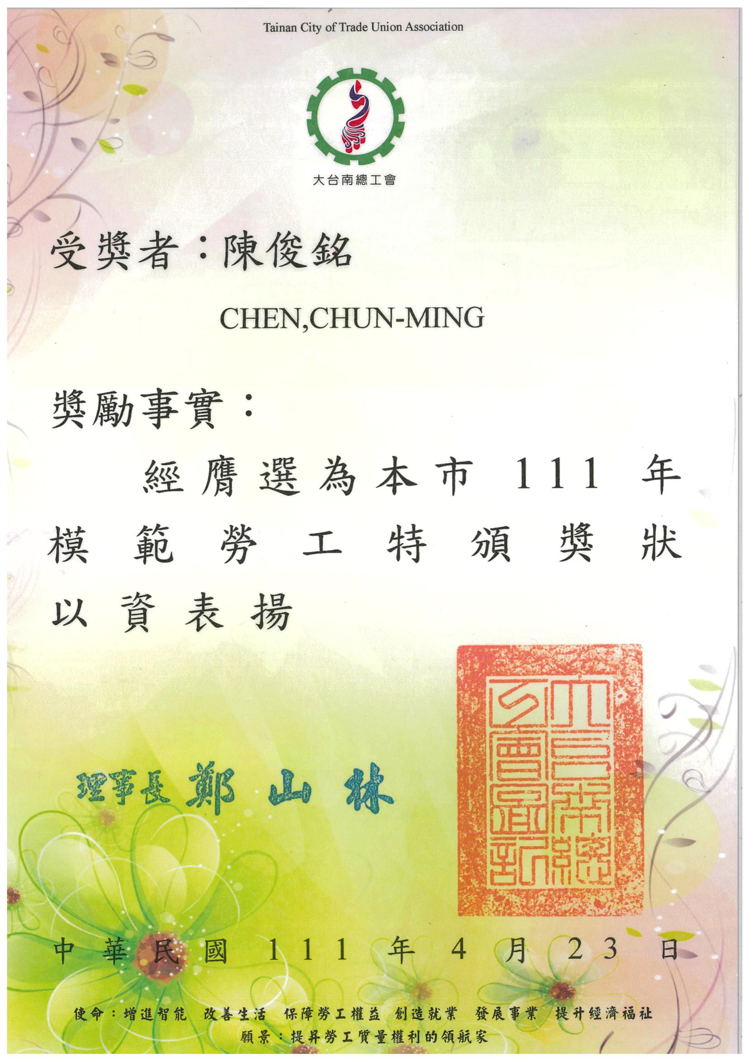 Mr. Chun-Ming, Chen was awarded as 2022 Outstanding Staff by Union of Associations of Tainan City.