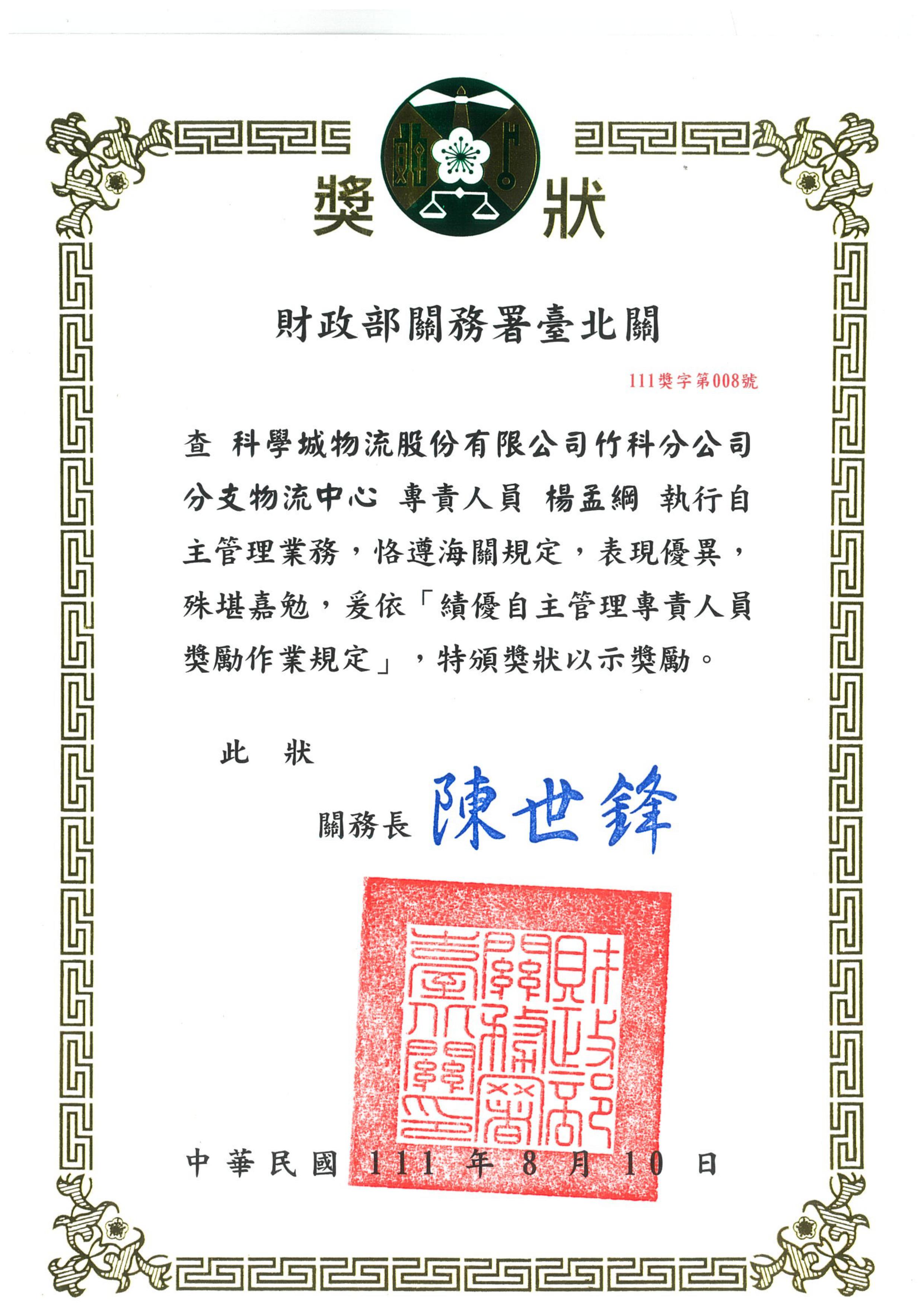 Mr. Meng-Kang,Yang was awarded as 2022 Outstanding Self-managed Staff by Customs Administration, Ministry of Finance.