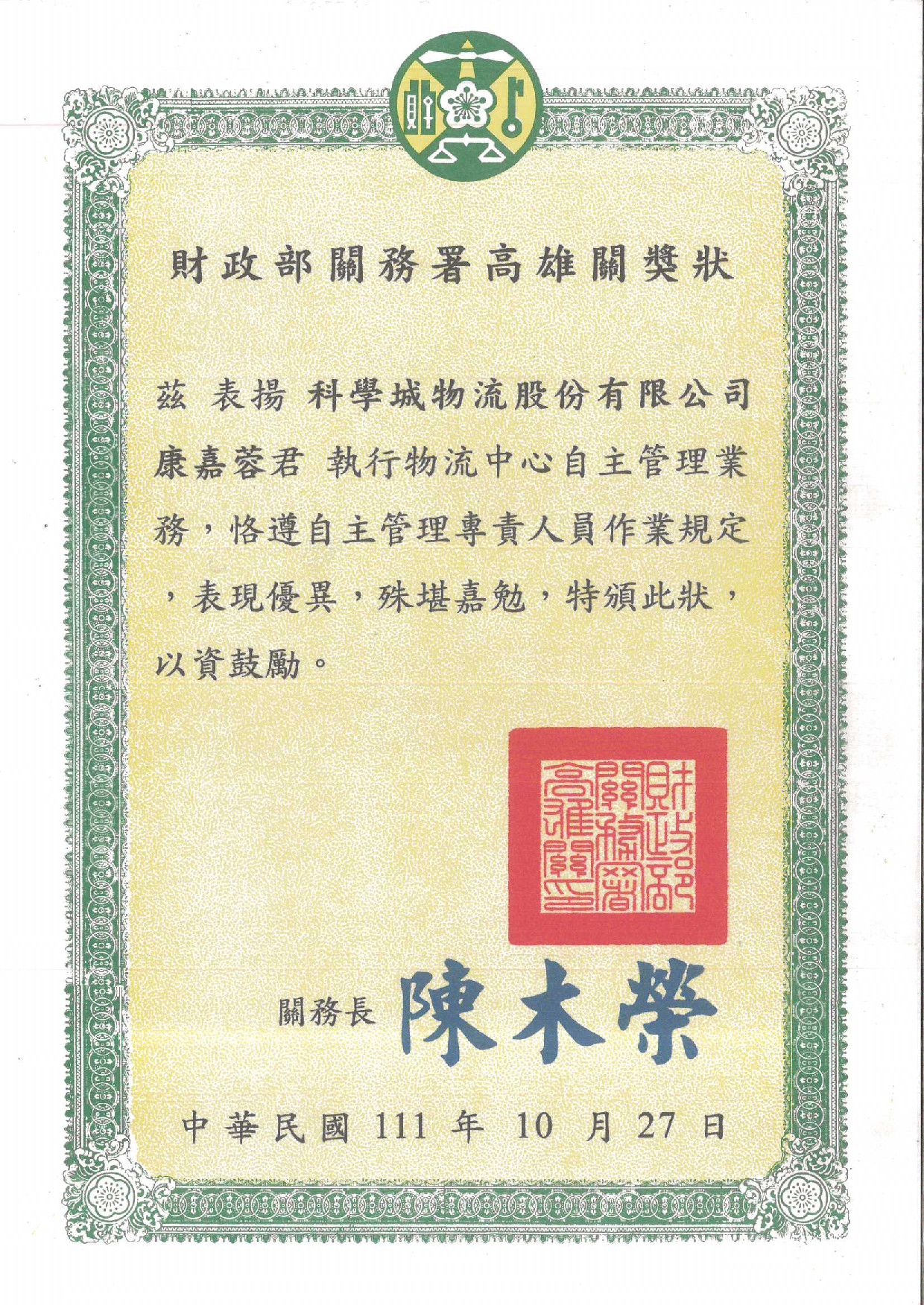 Ms. Jia-Rung, Kang was awarded as 2022 Outstanding Self-managed Staff by Customs Administration, Ministry of Finance.