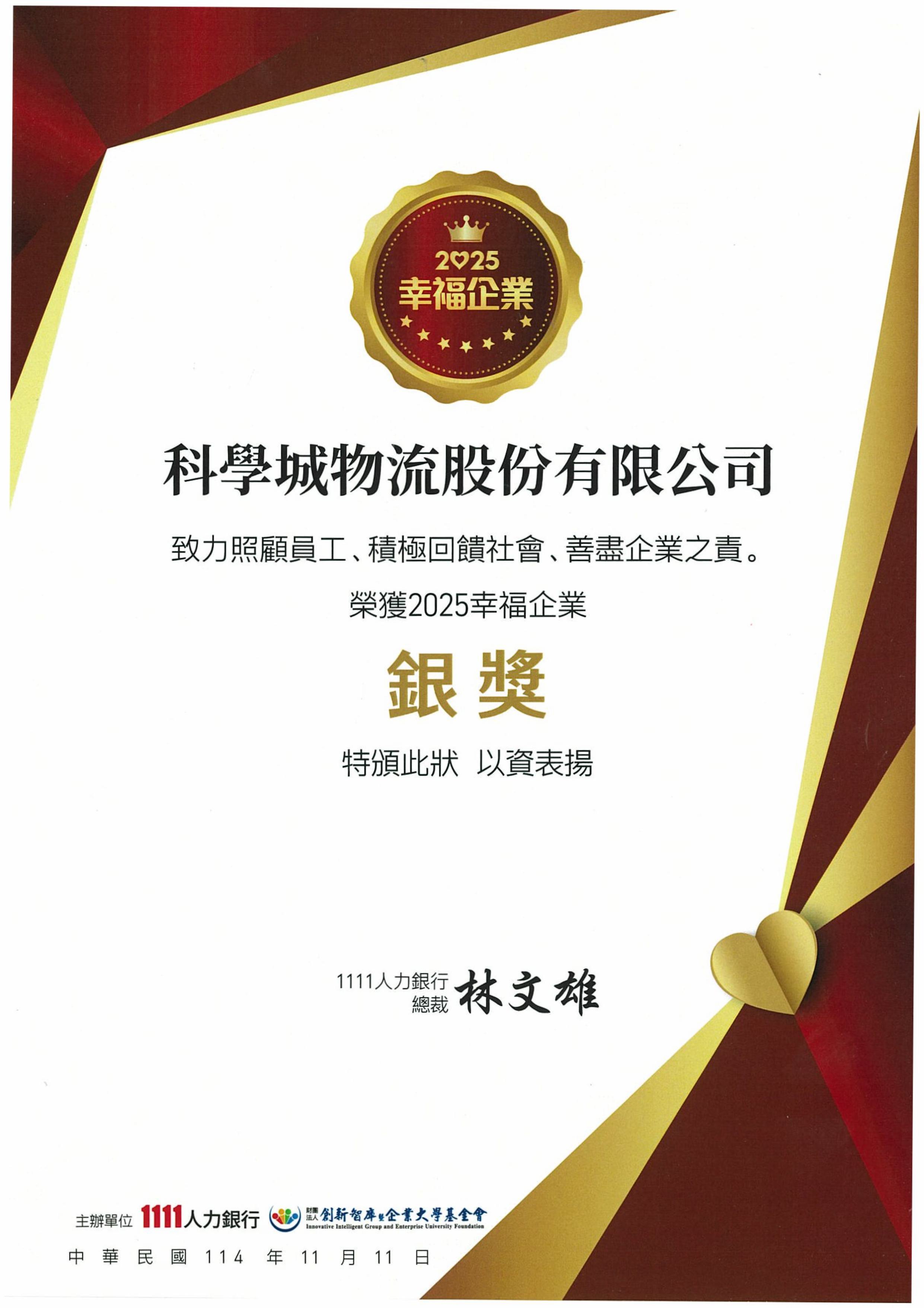 科學城物流榮獲1111人力銀行之「2025幸福企業銀獎」,特頒發證書表揚。