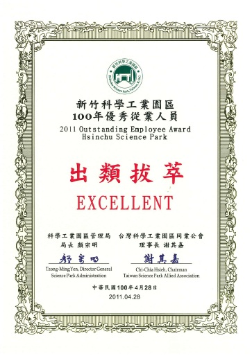 Mr. J.Y. CHEN of SPL was award as 2011 Outstanding Employee by Science Park Administration